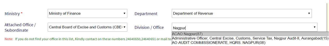 Nagpur in the listbox, it will show all the office having Nagpur as part of division/office name