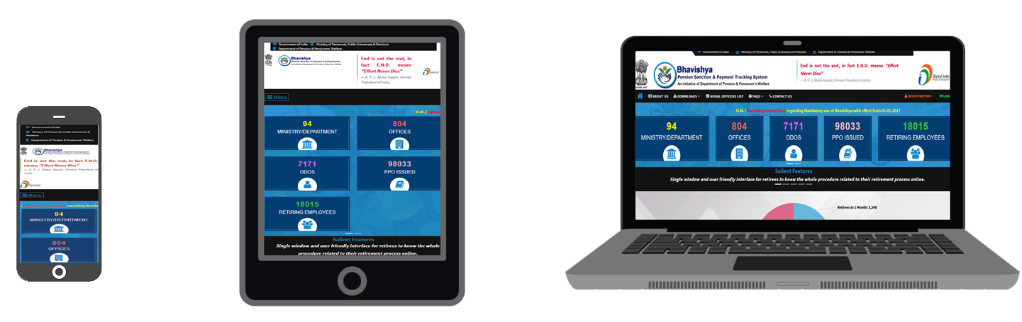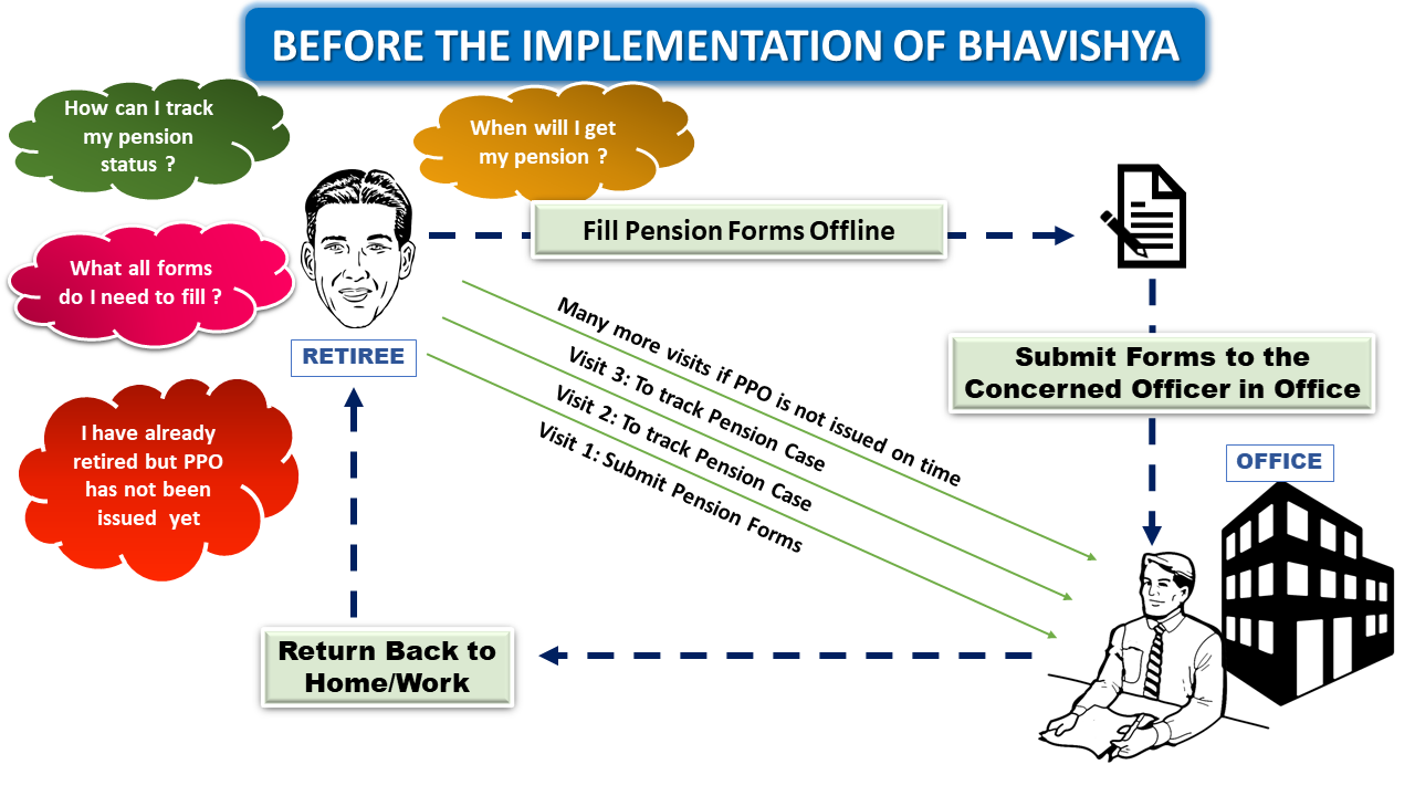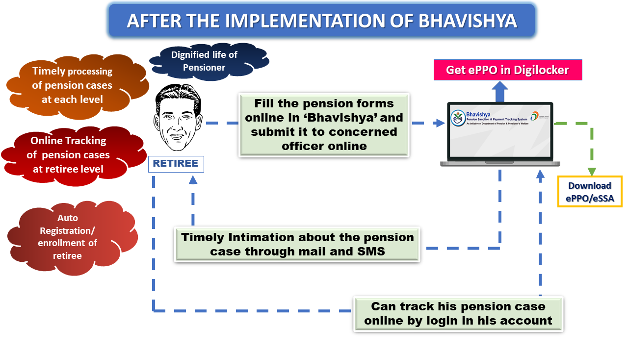 The goal is to ensure payment of all retirement dues and delivery of Pension Payment Order (PPO) to retiring employees on the day of retirement itself. Towards this goal, the department has launched an online Pension Sanction & Tracking System called 'BHAVISHYA'. The system provides online tracking of pension sanction process by the individual as well as the administrative authorities. The system captures the pensioners personal and service particulars. The forms for processing of pension can be submitted online. It keeps retiring employees informed of the progress of pension sanction process through SMS/E-Mail. The system obviates delays in payment of pension by ensuring complete transparency.